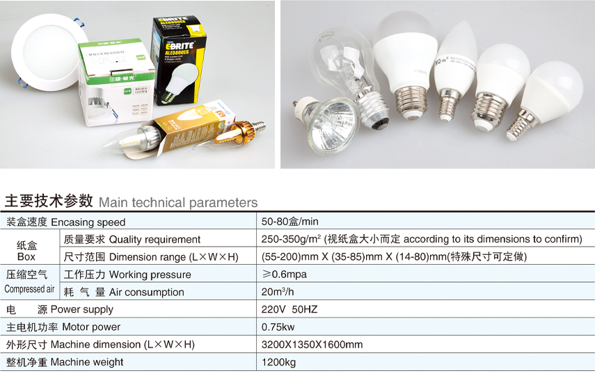 本產品是我公司結合國外包裝機的先進技術及根據目前照明、電子等行業的實際情況而研發的具有新型、先進的包裝機械設備,是機、電、氣、光- -體化的高科技產品。本產品適用于照明、電子等行業各類球泡燈、蠟燭(尾)燈、筒燈、射燈、單端熒光燈、節能燈、鎮流器等等以及相類似物品的裝盒包裝。具有將紙盒自動打開、物品裝盒、封盒等功能;同時也是解決目前招工難、管理難而代替勞動力的先進自動包裝設備。該機可以單獨使用亦可以與其他設備聯動使用,形成成套生產聯動線。