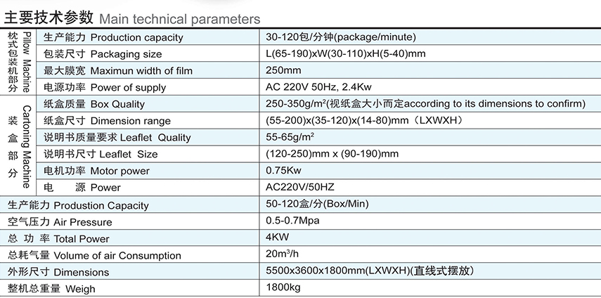 本產(chǎn)品是我公司結(jié)合國(guó)外生產(chǎn)聯(lián)動(dòng)線的先進(jìn)技術(shù)及根據(jù)國(guó)內(nèi)制藥行業(yè)的實(shí)際情況而研發(fā)的擁有新型、具有先進(jìn)的枕式/裝盒高速生產(chǎn)聯(lián)動(dòng)線,是機(jī)、電、氣光-體化的高科技生產(chǎn)線,性能相當(dāng)穩(wěn)定、成熟、操作簡(jiǎn)單。