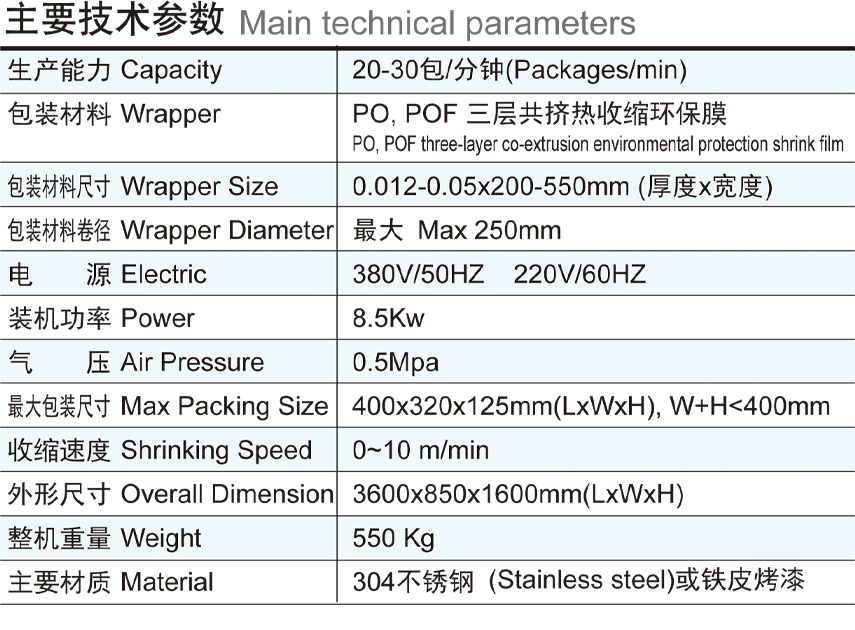 The product is suitable for assembly packaging of cartons coming out of the cartoning machine. It adopts PO, POF film to carry out fully closed heat shrink packaging. Packing modes include: single-row packaging, front and rear row packaging, and upper and lower row packaging. During feeding and packaging, the functions such as automatic completing of the object piling mode and its conveying to the designated position, automatic conveying of packaging film, automatic film cutting, and shrinking can be automatically completed. The equipment adopts photoelectric stepping control of bag length, stepless speed control of shrinking speed, human-machine PLC control, photoelectric tracking and variable frequency