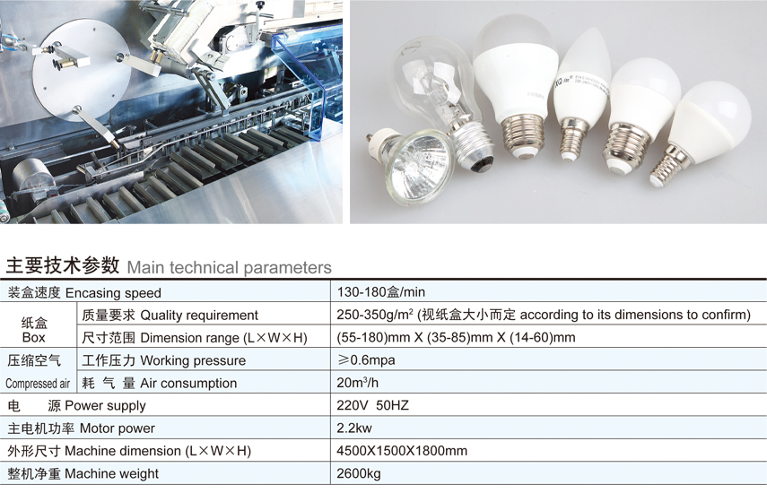 The product is the latest type of high-speed packaging equipment researched and developed by our company after combining advanced technology from Germany Bosch Company and considering actual conditions in such industries as lighting and electronics. It is a high-tech product with mechanical, electrical, pneumatic and optical integration. The product is suitable for cartoning packaging of various bulb lamps, candle lamps, downlights, spotlights, single-capped fluorescent lamps, energy saving lamps, ballasts, T8, T5 and other similar objects in such industries as lighting and electronics. It has such functions as automatic carton opening, object cartoning and box sealing. It is also the most advanced automatic packaging equipment that solves the problem of hard employment and management and replaces labor force. The machine can be used singly or work with other equipment together to form a complete set of production line.